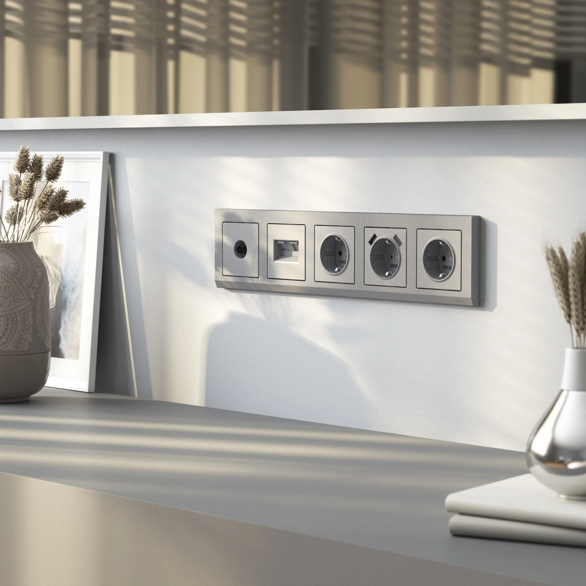 Лицевая панель выполнена в матовом серебряном цвете с бархатистой фактурой и тактильной мягкостью. Такая поверхность не бликует, не притягивает пыль и идеально вписывается в любые стили — от скандинавского минимализма до лофта и классики. Белый цвет гармонично сочетается с любыми отделочными материалами, а универсальная совместимость со всеми рамками Werkel позволяет создавать индивидуальные композиции под ваш вкус.