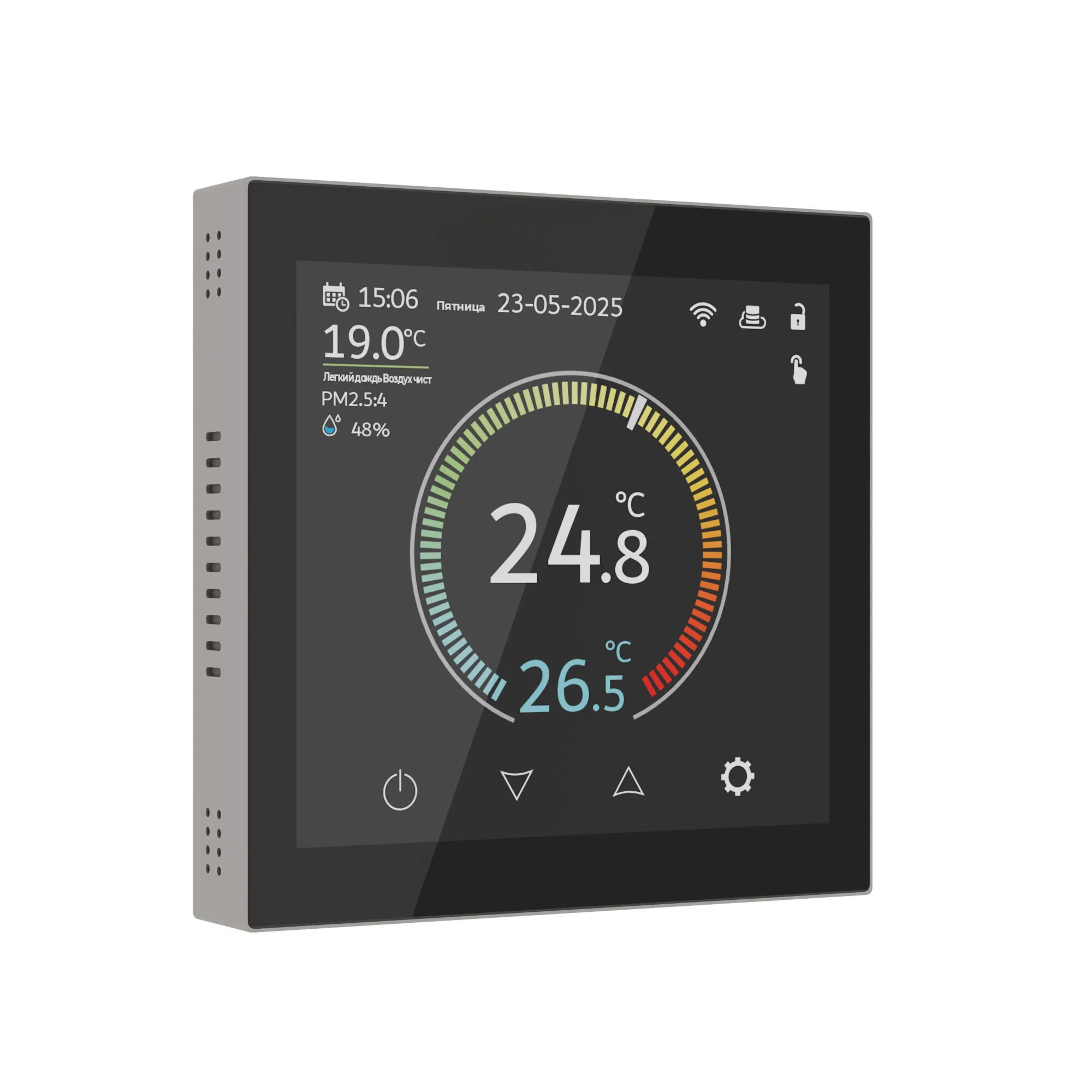 Терморегулятор от Werkel получил стильный безрамочный корпус в дымчатом цвете и сенсорный TFT-IPS-LCD дисплей с превосходной чувствительностью и широким углом обзора.