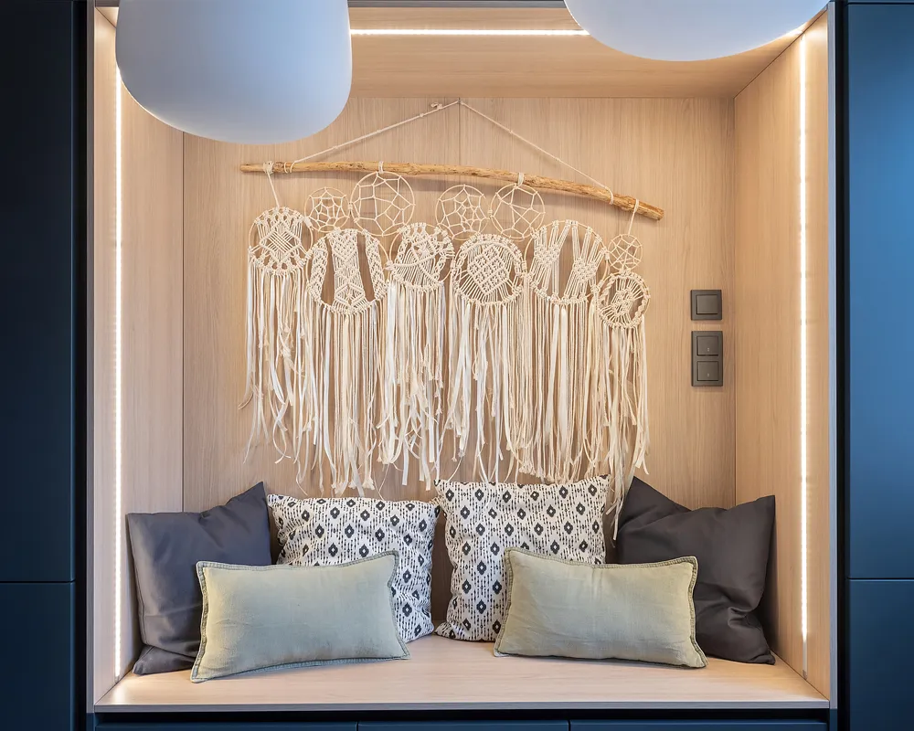 Тёплые сливочные тона кухни разбавили тёмными фасадами цвета сажи, добавив интерьеру глубины и контраста. Идеально ровный потолок украсили встроенные споты 9914 LED, которые стали основным источником верхнего света. Эти светильники создают эффект «света из ниоткуда», благодаря чему кухня выглядит современно и стильно .